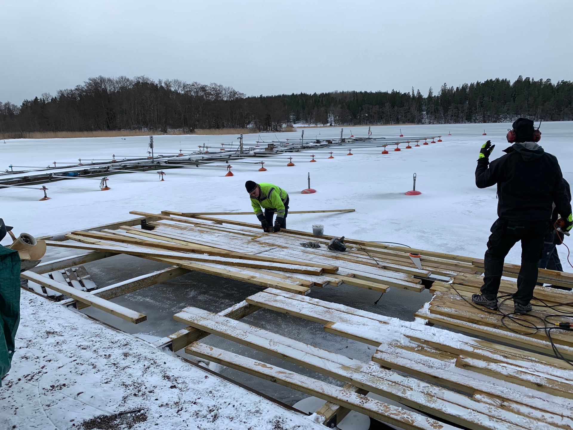 Bygget med nya kranbryggan är nu i full gång. Under helgen har det skruvats och sågats med entusiasm. Nya bryggan har tagit form, kommer bli ett stort "lyft" för hamnområdet
